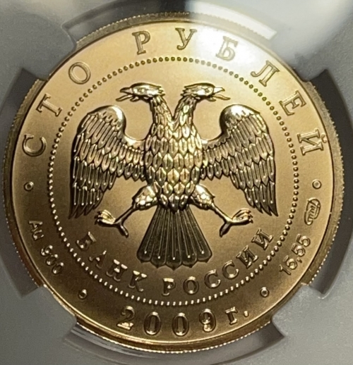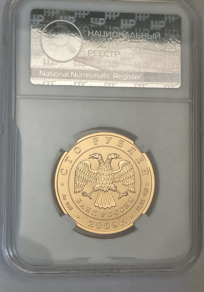 в центре диска - эмблема Банка России (двуглавый орел с опущенными крыльями, под ним надпись полукругом "БАНК РОССИИ"), обрамленная кругом из точек и надписями по кругу: вверху - "СТО РУБЛЕЙ", внизу - "2009 г.", слева - обозначение металла, проба сплава, справа - содержание драгоценного металла в чистоте и товарный знак монетного двора.