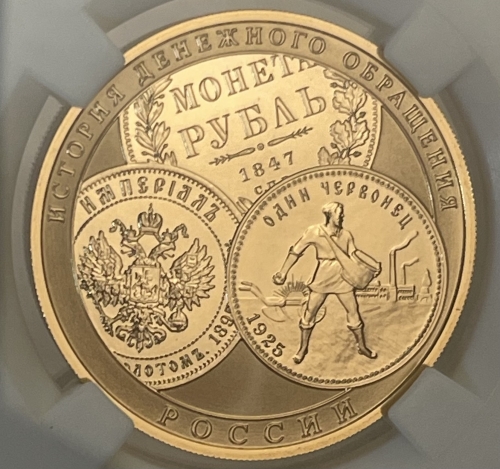 изображения трёх монет: вверху - серебряного рубля Николая I, слева - золотого империала Николая II, справа - золотого червонца советского чекана, по окружности - надпись: "ИСТОРИЯ ДЕНЕЖНОГО ОБРАЩЕНИЯ РОССИИ".