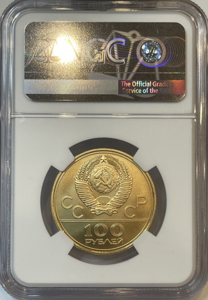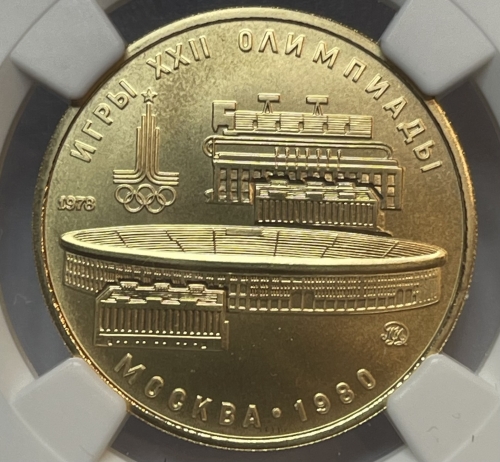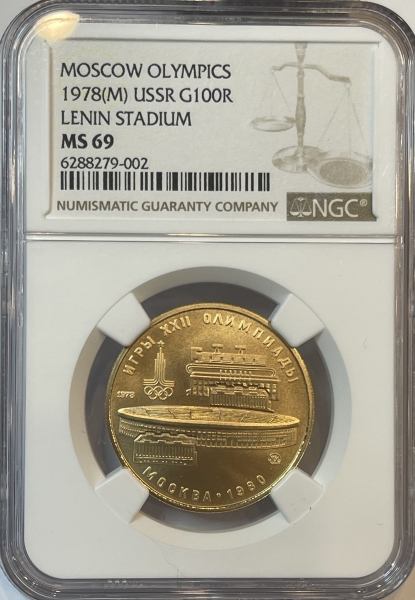 Золотая монета 100 рублей "Стадион имени В.И. Ленина, Лужники" Олимпиада 80, 1978г., в слабе NGC MS 69