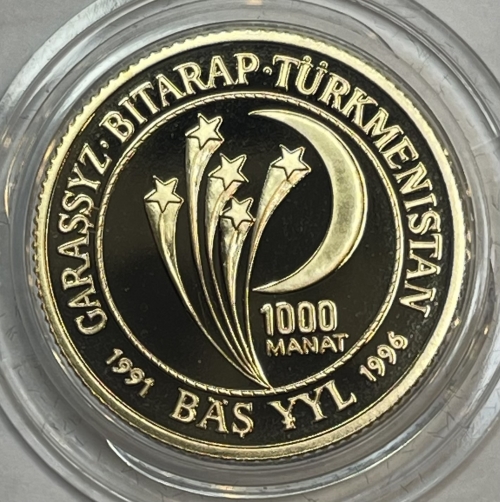 • Золотая монета номиналом 1000 манат, выпущенная Туркменистаном в 1996, 916 проба, общий вес 7.98 грамм. Монета в закручивающейся капсуле. Чеканка Королевский Монетный Двор Великобритании. Родной Сертификат, Коробка. На монете изображен Сапармурат Ниязов также известный как Туркменбаши, был туркменским политиком, правившим Туркменистаном с 1985 года до своей смерти в 2006 году.