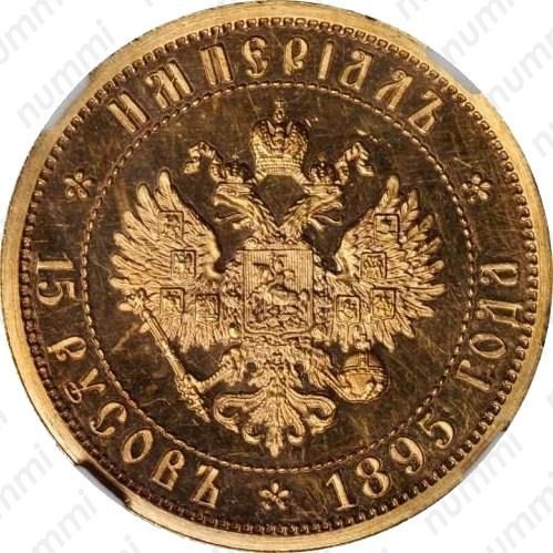 В правой лапе орёл держит скипетр, а в левой державу. Государственный Герб заключён в витую окружность. За окружностью, вдоль канта, текст:ИМПЕРIАЛЪ│15 РУСОВЪ│1895 ГОДАразделённая на три части тремя цветочными розетками. Буртик украшен зубцами.