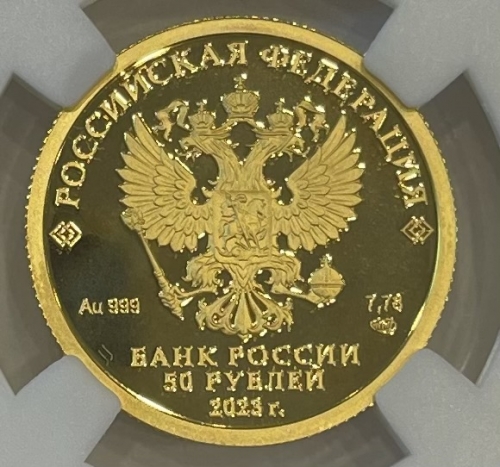 Золотая монета 50 рублей "Белка" в слабе ННР PROOF 70 ,7,78г, 2023 год