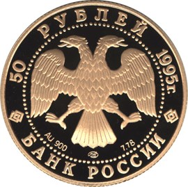 в центре диска — эмблема Банка России (двуглавый орёл художника И. Билибина), в нижней части — обозначение металла, проба сплава, товарный знак монетного двора и содержание драгоценного металла в чистоте. По окружности надписи, обрамлённые кругом из точек: вверху — «50 РУБЛЕЙ 1995 г.», внизу — «БАНК РОССИИ».