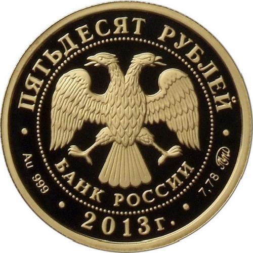 в центре — эмблема Банка России (двуглавый орёл с опущенными крыльями, под ним — надпись полукругом «БАНК РОССИИ»), обрамленная кругом из точек и надписями по кругу — вверху: «ПЯТЬДЕСЯТ РУБЛЕЙ», внизу: слева — обозначения драгоценного металла и пробы сплава, в центре — год выпуска «2013 г.», справа — содержание химически чистого металла и товарный знак монетного двора.