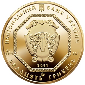 В центре, в восьмиугольном картуше на щите, изображена эмблема Национального банка Украины, состоящая из алегоричныхфигур грифонов, между которыми изображена гривна- денежно-весовая единица Киевской Руси.Эта эмблема символизирует сохранность и приумножение золотого запаса государства. Кроме того, на аверсе монеты размещены номинал монет, год чеканки, а также название металла, проба и его чистая масса.