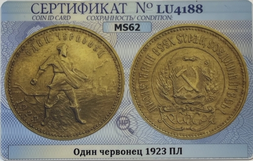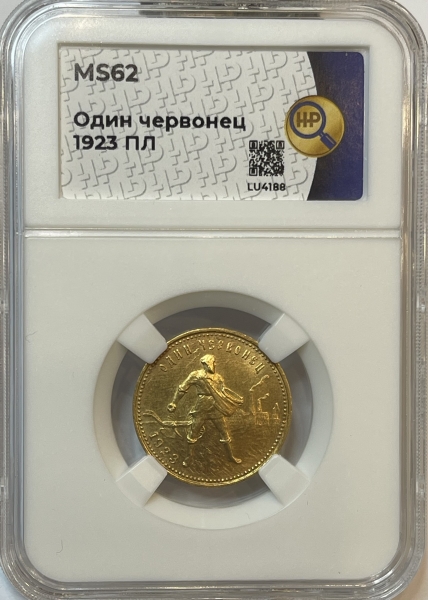 Золотая монета Червонец Сеятель 1923 г. в слабе ННР MS 62