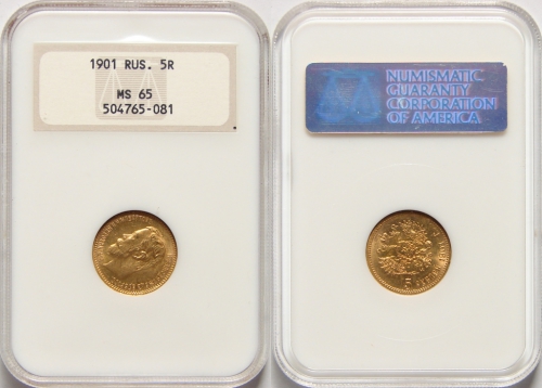Золотая монета Николая II 5 рублей 1901 год состояние MS 65