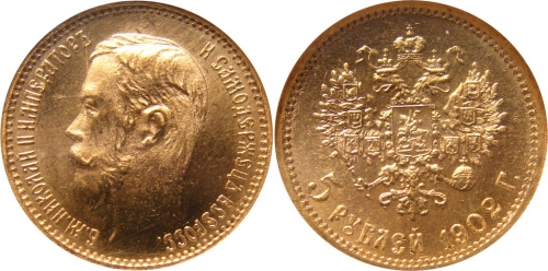 В эпоху Императора Николая II золотые монеты 5 рублей чеканились в период с 1897 до 1911 года с небольшим перерывом, имели хождение в Российской Империи наравне с бумажными деньгами.